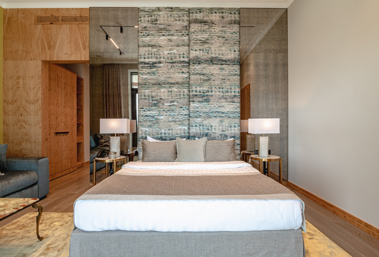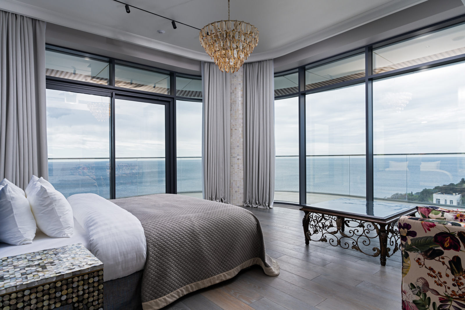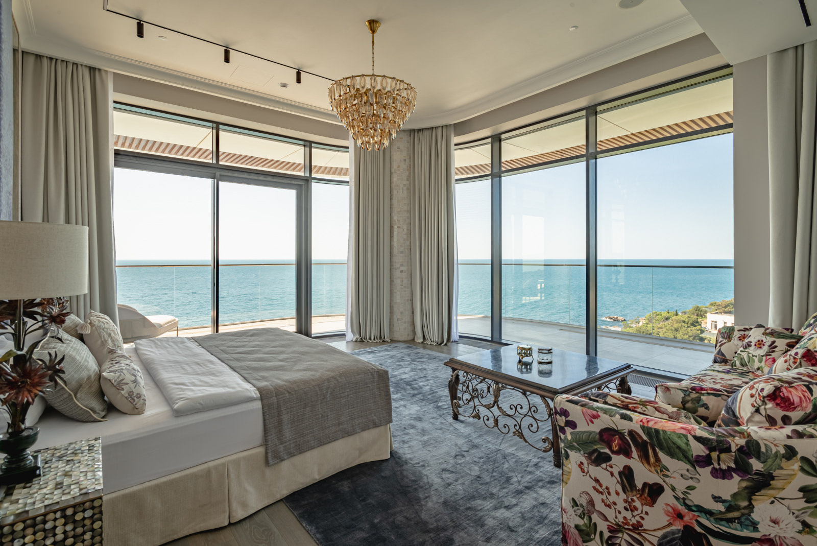 Площадь номера - 185 кв.м. 4 осн. места. 2 доп. места. Балкон. Кухня. Мебель: гардеробная, диван (3), зеркало, кровать двуспальная (2), кухонная мебель, прикроватные тумбочки, стол, столик журнальный, стол обеденный, стулья, шкаф. Оборудование: гладильная доска, кофемашина, микроволновая печь (по запросу), набор посуды, плита электрическая, пляжные полотенца, сейф, сплит-система, телевизор, телефон, утюг, холодильник, чайный набор посуды, электрочайник. Санузел: 3 санузла, с джакузи (1), с душевой кабиной (3), тапочки, туалетные принадлежности, фен, халат. Сервис: Wi-Fi бесплатно, карточная система замков, мини-бар, смена полотенец, смена постельного белья, уборка номера.