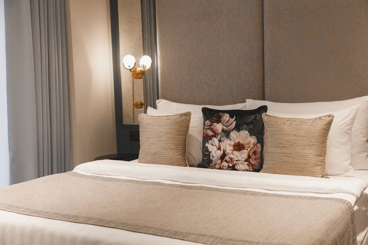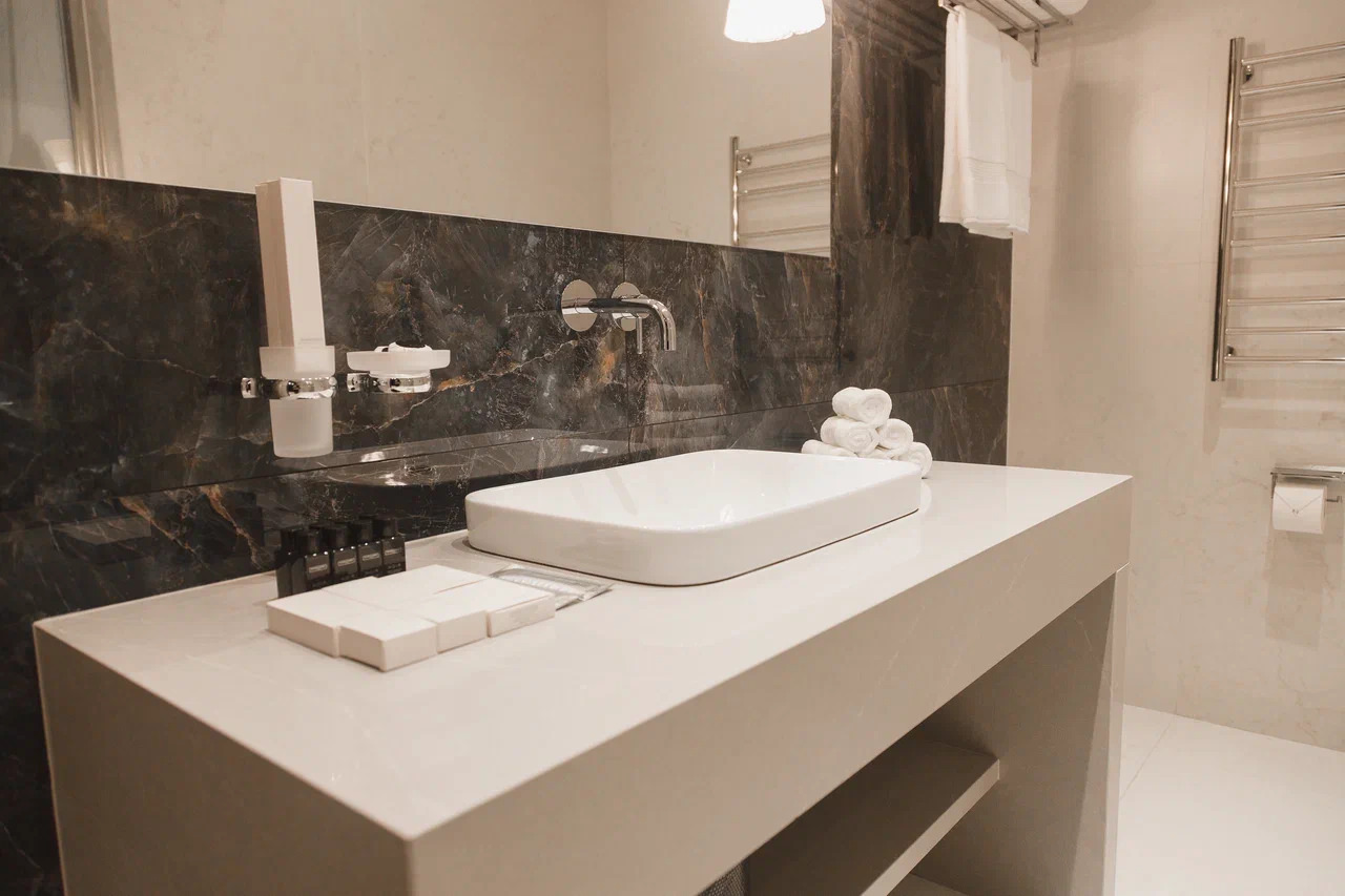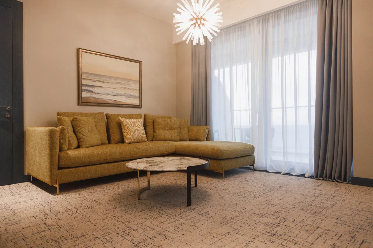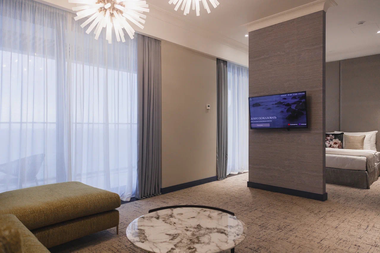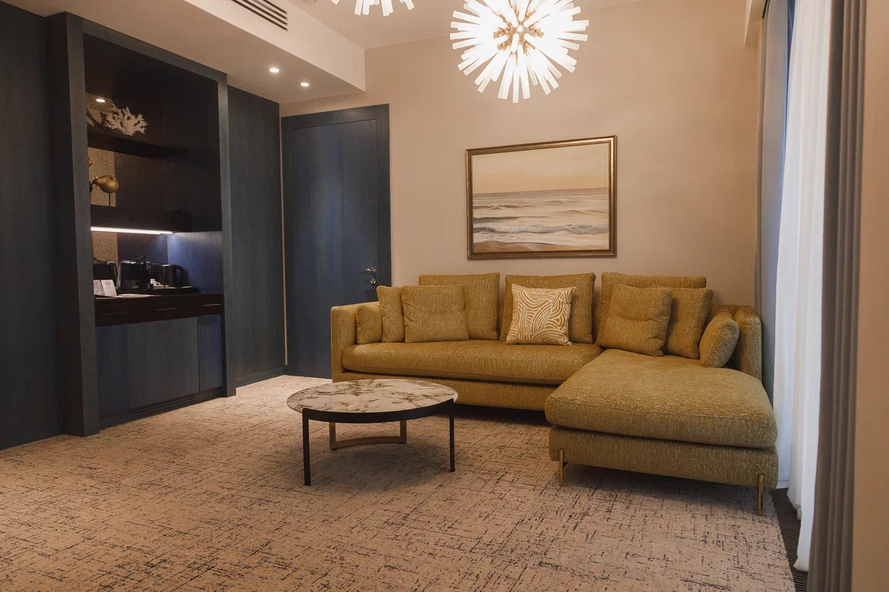 Площадь номера - 45 кв.м. 2 осн. места. Балкон. Мебель: вешалка, гардеробная, диван, зеркало, кровать двуспальная, прикроватные тумбочки, стол, стулья, шкаф. Оборудование: гладильная доска, кофемашина, пляжные полотенца, сейф, сплит-система, телевизор, телефон, утюг, холодильник, чайный набор посуды, электрочайник. Санузел: с душевой кабиной, тапочки, туалетные принадлежности, фен, халат. Сервис: Wi-Fi бесплатно, карточная система замков, услуги внутренней телефонной связи, услуги междугородней телефонной связи, услуги международной телефонной связи.