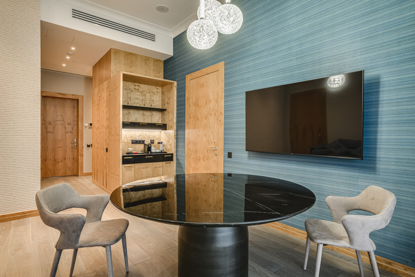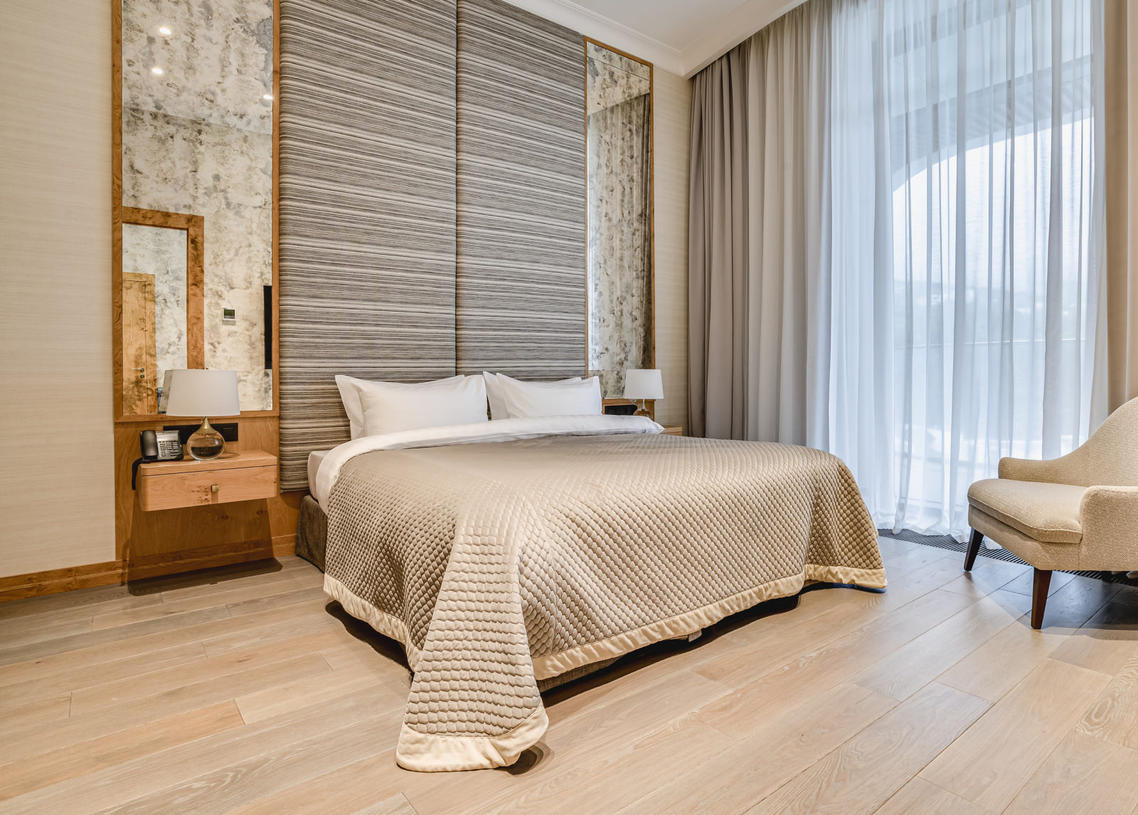 Площадь номера - 50-53 кв.м. 2 осн. места. 2 доп. места. Балкон. Мебель: вешалка, диван, зеркало, кровати односпальные /одна двуспальная кровать, прикроватные тумбочки, стол, стулья, шкаф. Оборудование: гладильная доска, кофемашина, пляжные полотенца, сейф, сплит-система, телевизор, телефон, утюг, холодильник, чайный набор посуды, электрочайник. Санузел: с душевой кабиной, тапочки, туалетные принадлежности, фен, халат. Сервис: Wi-Fi бесплатно, карточная система замков, мини-бар, смена полотенец, смена постельного белья, уборка номера.
