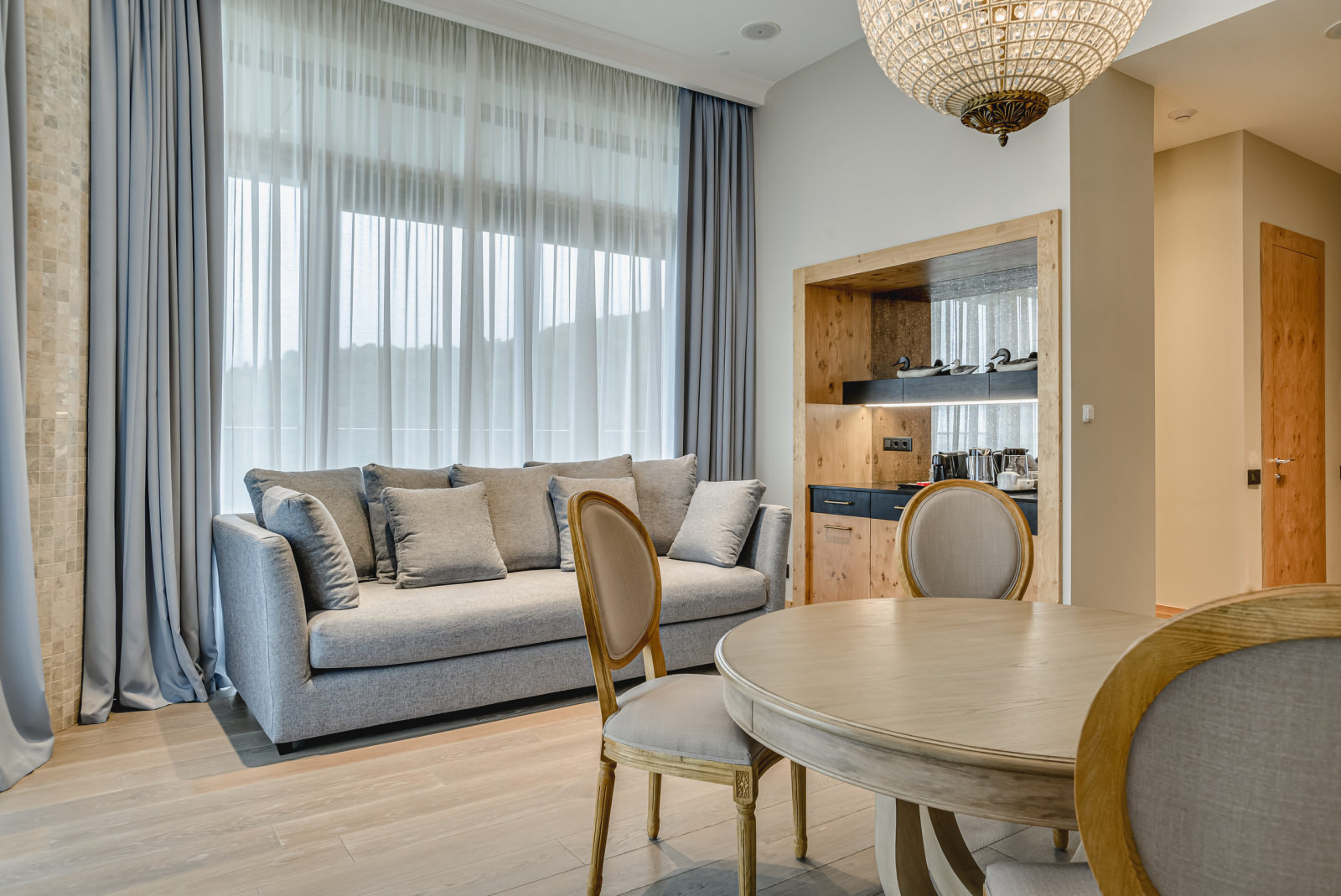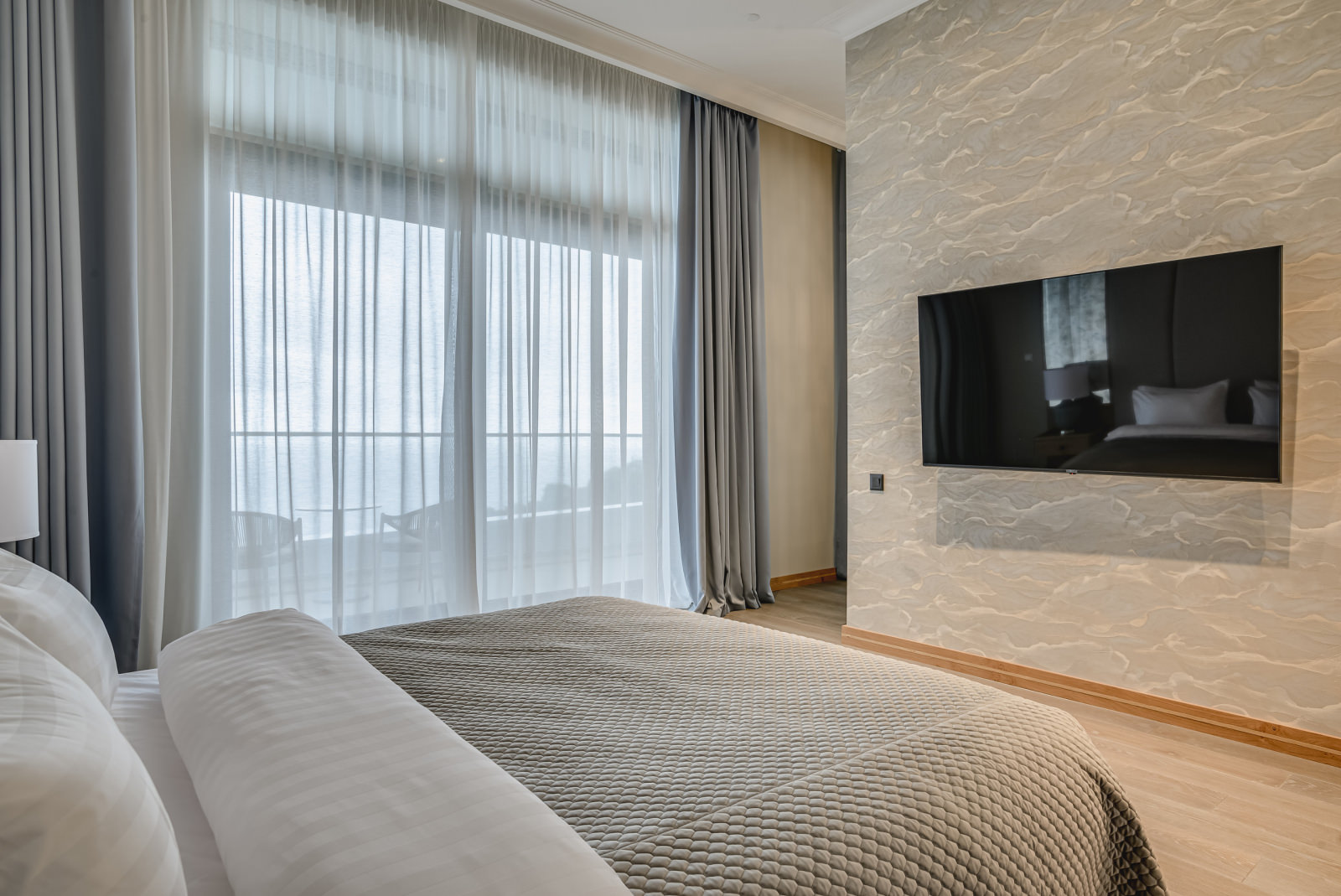 Площадь номера - 67-70 кв.м. 2 осн. места. 2 доп. места. Балкон. Мебель: вешалка, диван раскладной, зеркало, кровать двуспальная, прикроватные тумбочки, стол, стулья, шкаф. Оборудование: гладильная доска, кофемашина, пляжные полотенца, сейф, сплит-система, телевизор, телефон, утюг, холодильник, чайный набор посуды, электрочайник. Санузел: с душевой кабиной, тапочки, туалетные принадлежности, фен, халат. Сервис: Wi-Fi бесплатно, карточная система замков, мини-бар, смена полотенец, смена постельного белья, уборка номера.