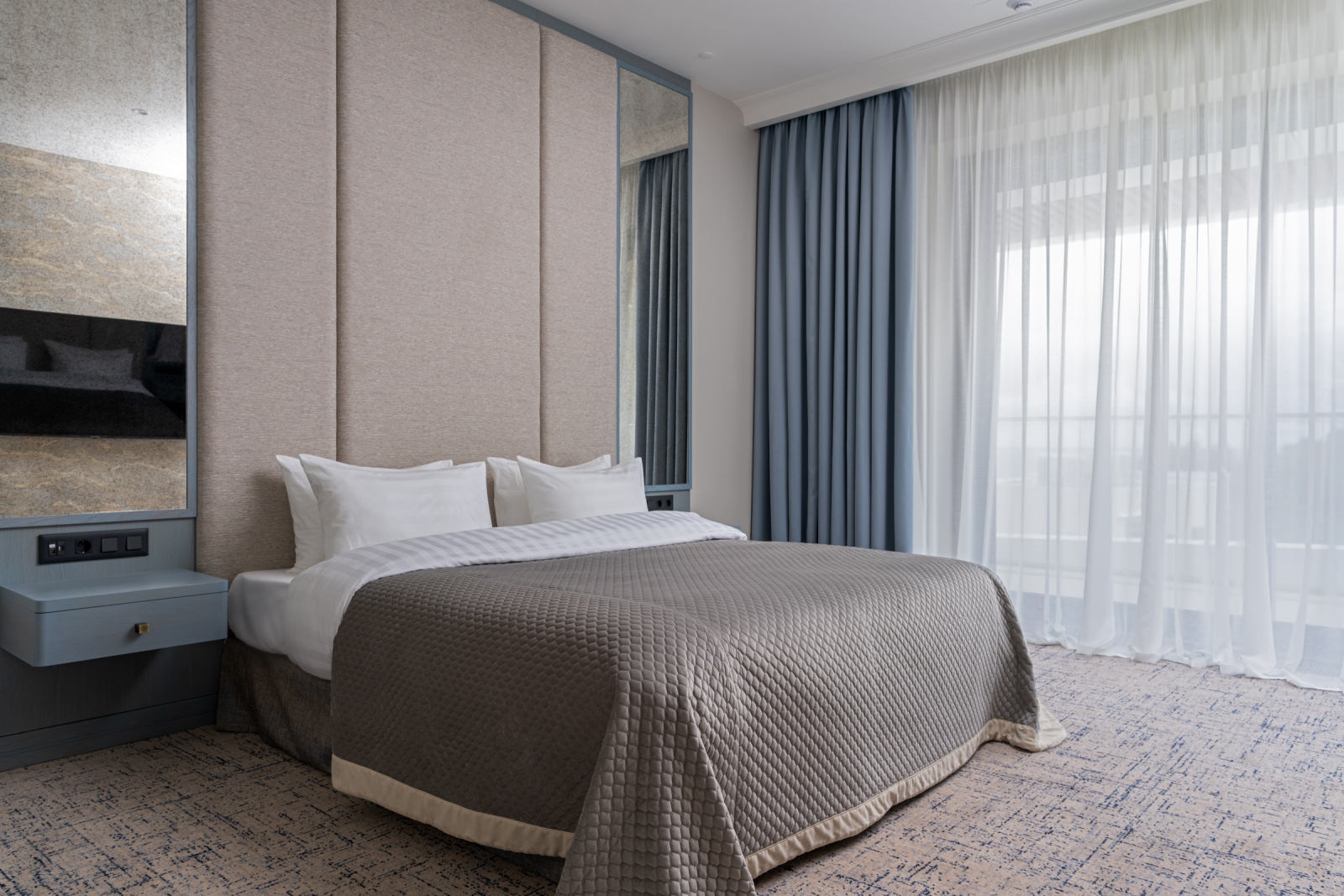 Площадь номера - 43 кв.м. 2 осн. места. Балкон. Мебель: вешалка, зеркало, кровати односпальные /одна двуспальная кровать, прикроватные тумбочки, стол, стулья, шкаф. Оборудование: гладильная доска, кофемашина, пляжные коврики, сейф, сплит-система, телевизор, телефон, утюг, холодильник, чайный набор посуды, электрочайник. Санузел: с душевой кабиной, тапочки, туалетные принадлежности, фен, халат. Сервис: Wi-Fi бесплатно, карточная система замков, смена полотенец, смена постельного белья, уборка номера.